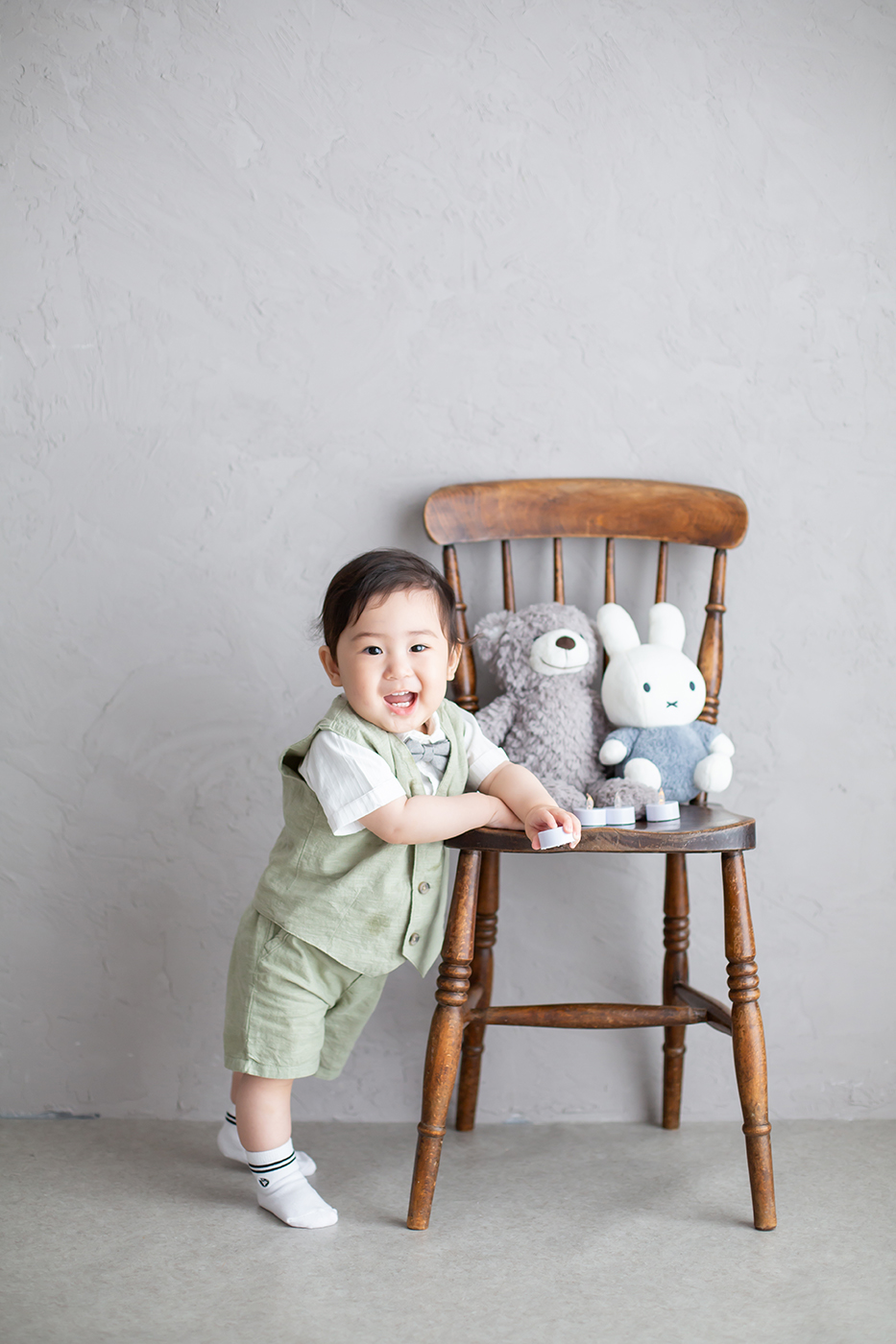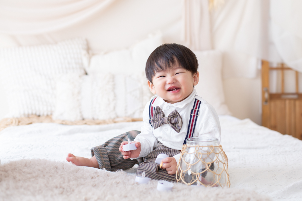 大阪お誕生日撮影|吹田の1日2組限定プライベートフォトスタジオで残す、バースデーフォト|1歳男の子にこにこ
